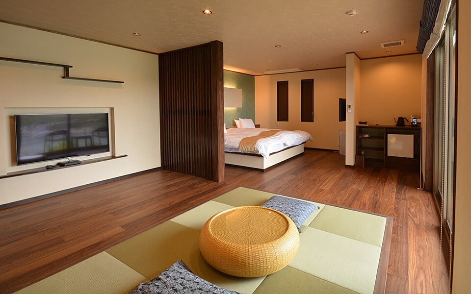 お部屋はお客様の寛ぎの空間を意識して、あまり華美にせずシンプルかつシックに、地元の作家さんが創る伝統工芸品の漆器や盆栽、絵画などを取り入れた空間となっています。
