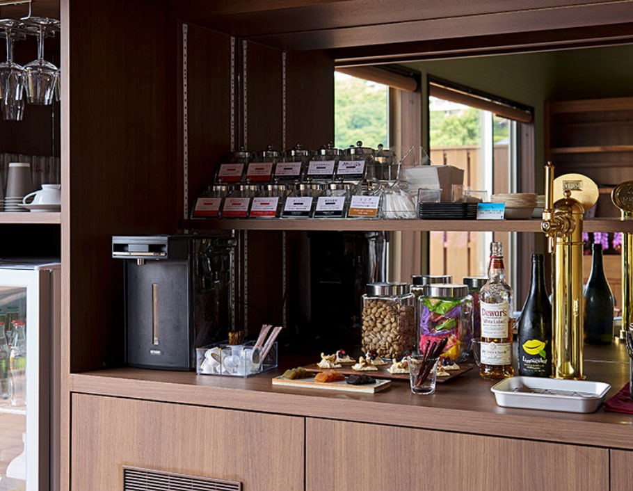 フリーラウンジでは、厳選した紅茶や果汁100%ジュースなどのお飲み物や、生ビールのサーバーやスコッチウイスキー、ジンなどを無料でお楽しみいただけるようにしています。