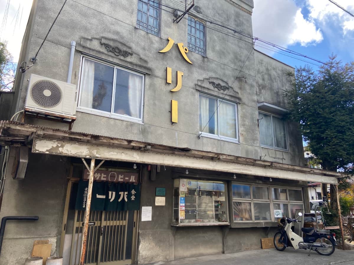 登録有形文化財にも指定されている、昭和にタイムスリップしたようなレトロな建物の「パリー食堂」。
