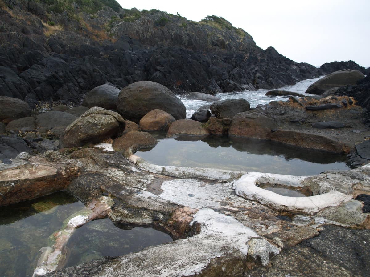 自然にできた窪みに少し手を加えて作られた2つの浴槽は男女混浴で、脱衣所がないので、岩陰で着替える必要があります。
