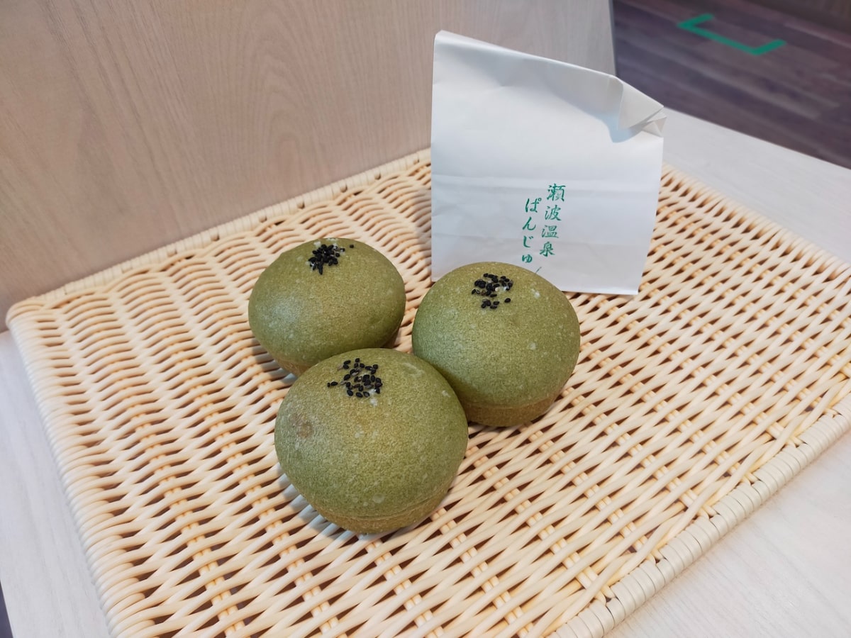 県内産の米粉や笹川流れの塩(笹川流れ沿岸地域の海水を使用した、えぐみのないまろやかな味が特徴の塩)などで作られている温泉地らしいパンのおまんじゅうで、うぐいす色の美しい見た目の秘密は村上茶の粉末です。