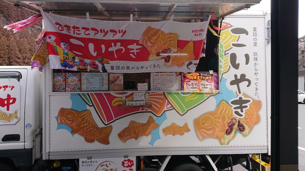 また、玖珠(くす)町では5月5日に行われる日本童話祭に、3匹の巨大な鯉のぼりが登場することから、駐車場では焼きたての「こいやき」(160円〜)の販売もされています。
