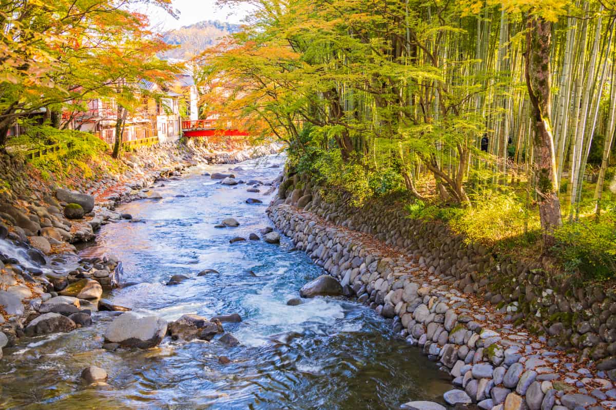 修善寺川(桂川)の両岸に温泉旅館・施設、無料の足湯、食事処が立ち並び、また、その美しさが世界的にも評価されている「竹林の小径」などの観光スポットもあります。