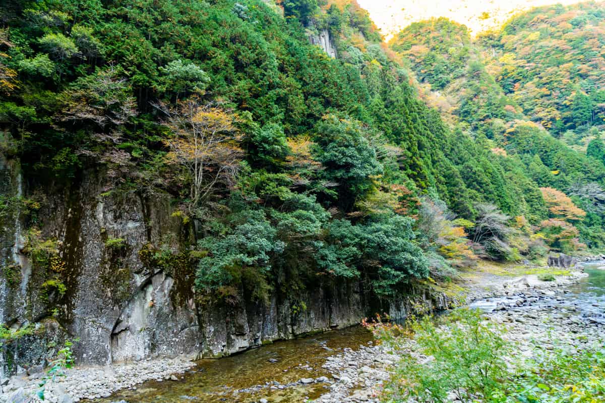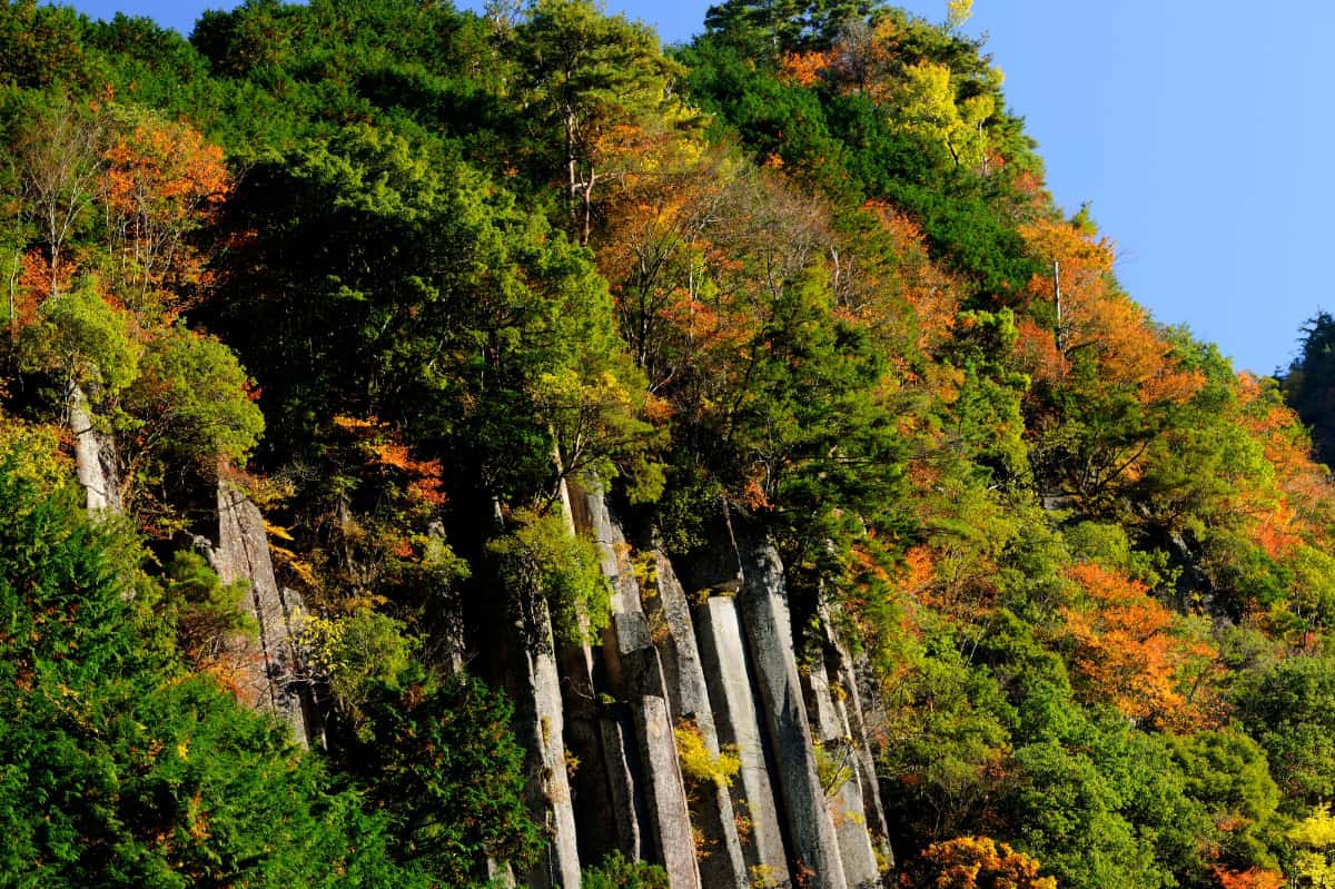 香落渓では、まるで斧で断ち割ったかのような柱状節理の岩肌が何キロも続く自然美を楽しむことができます。