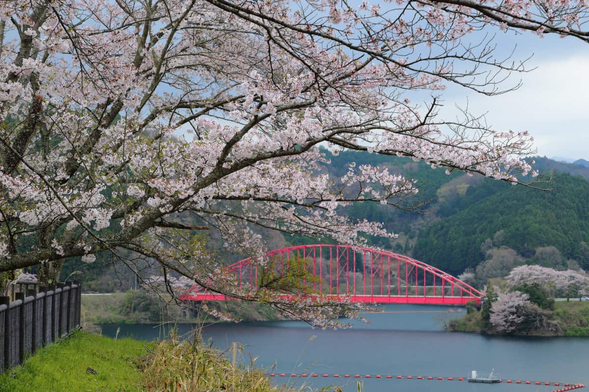 春になれば青蓮寺周辺には桜が満開となり、湖と桜のコントラストが見事。