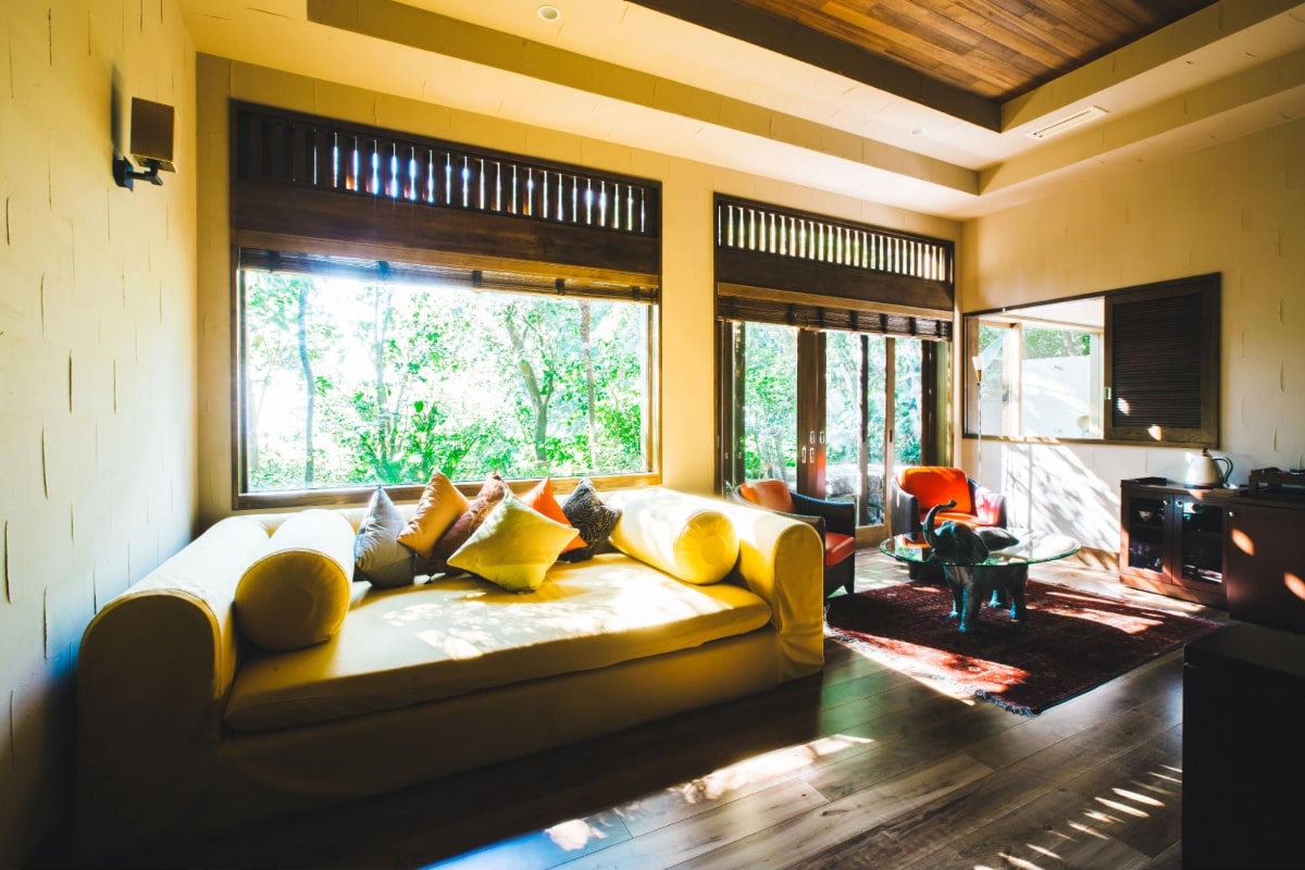 ヴィラA・Bのお部屋は、漆喰(しっくい)の塗壁と引き戸の窓など、風通しが良い、昔の日本家屋を意識した造りを基本としています。