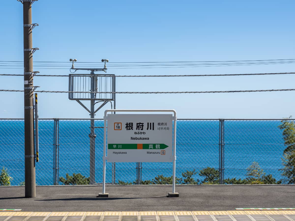 小田原駅、早川駅を過ぎると次は、見下ろす崖の上にある根府川(ねぶかわ)駅。