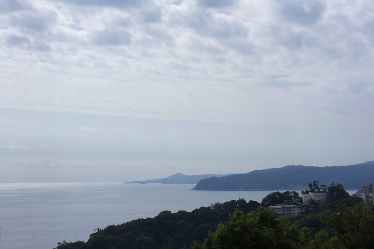 真鶴(まなづる)駅から湯河原(ゆがわら)駅の間にくると、海の先に伊豆の山並みが。