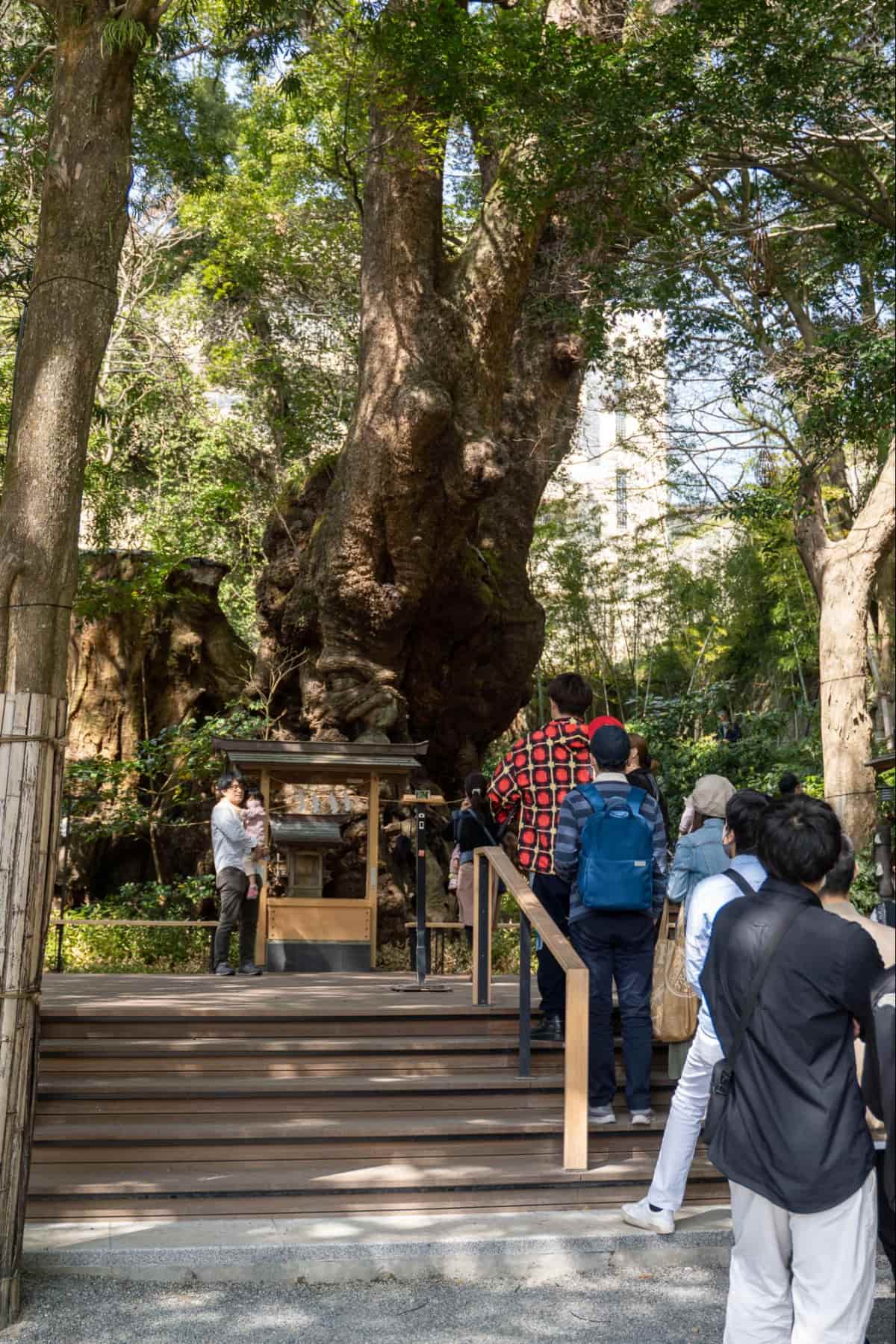 樹齢2,100年を超える大楠の幹を1周まわると、寿命が1年延びることで有名です。