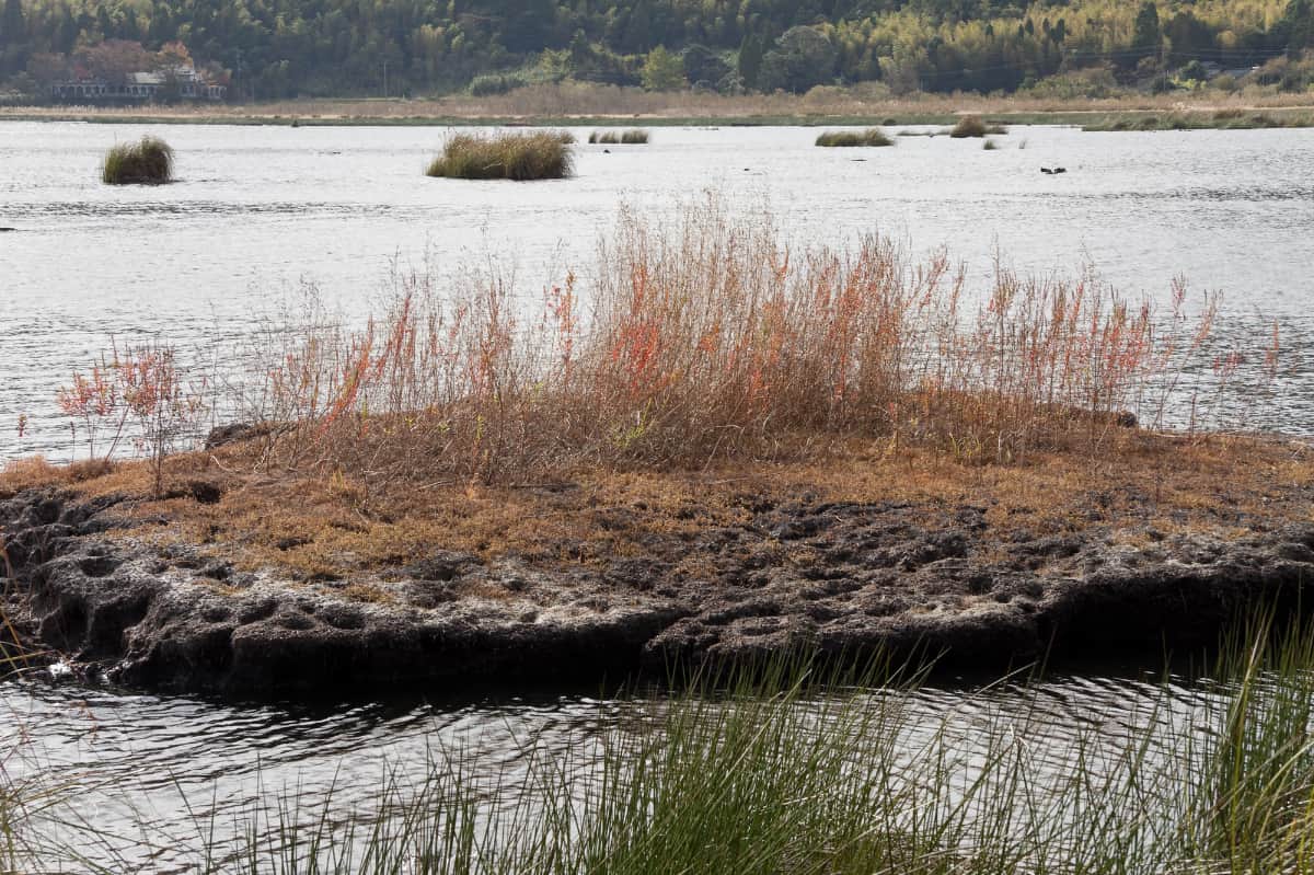 藺牟田池は火口湖で、湖の西側には泥炭層が堆積した湿原が広がり、一帯がラムサール条約に登録されています。(※ラムサール条約とは、湿地の生態系を守る目的としてつくられた条約のこと)
