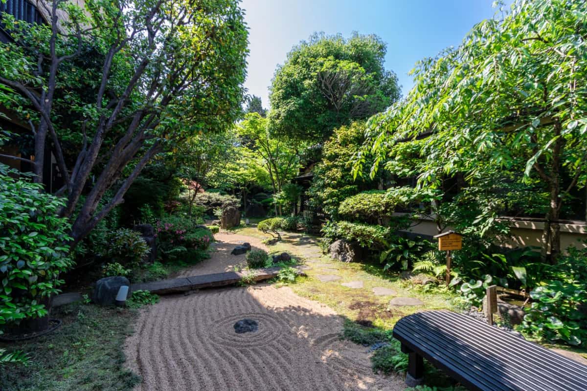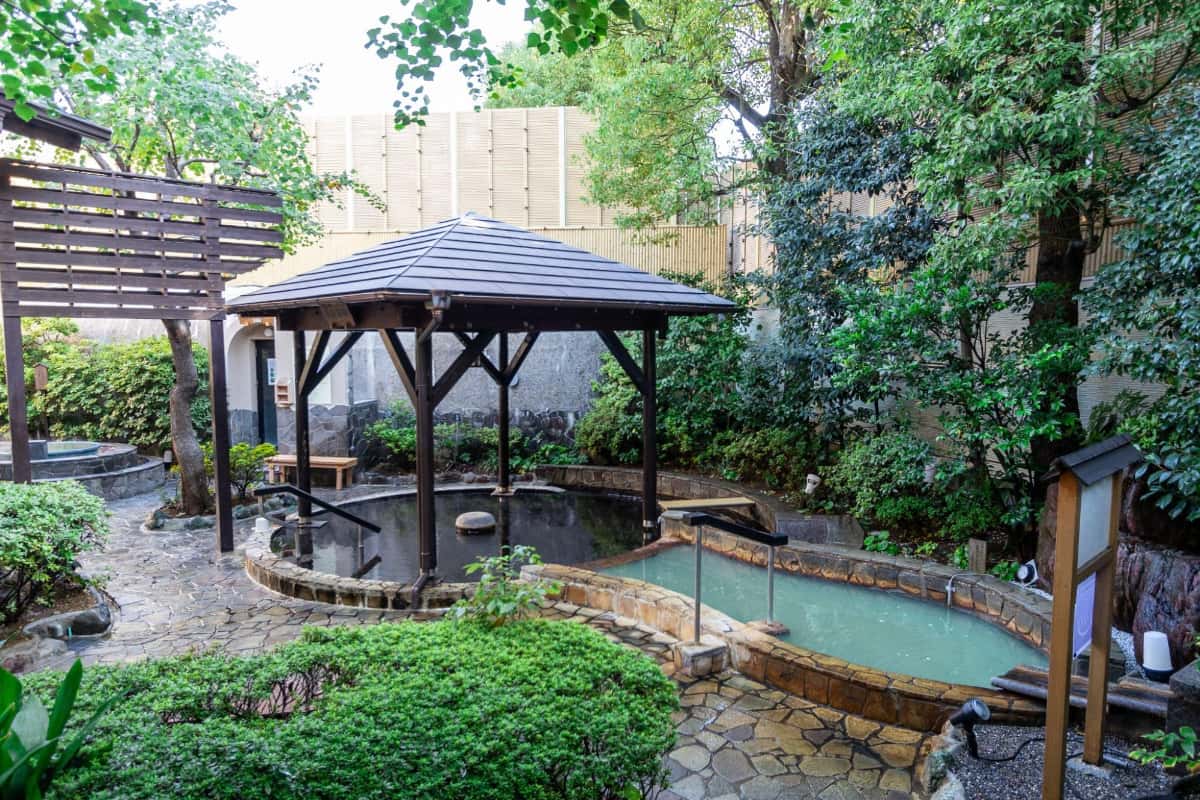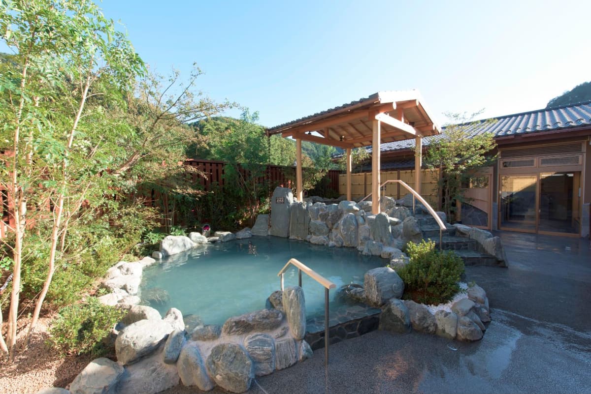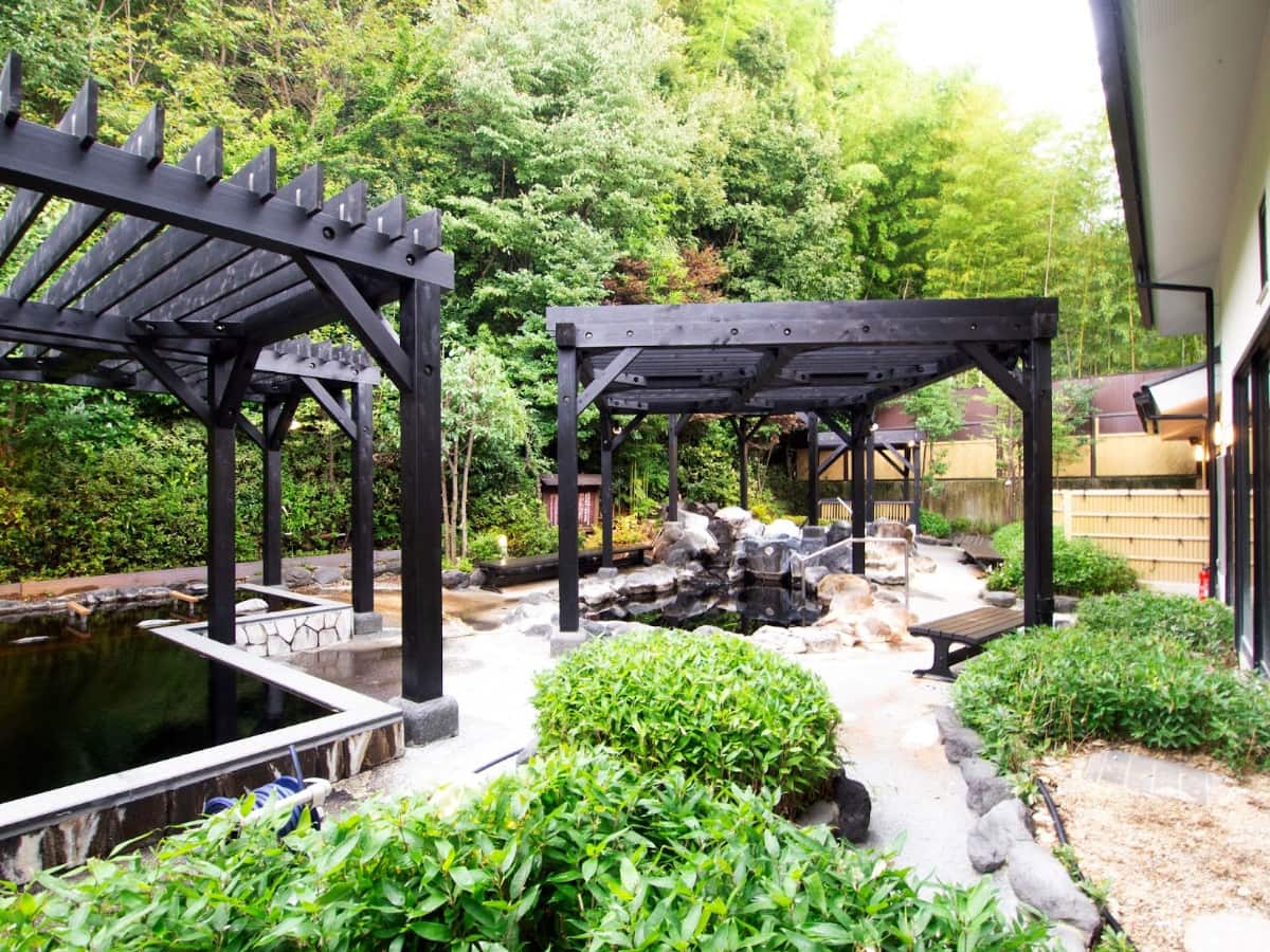 露天風呂は木々の鮮やかな緑と岩に囲まれており、東京に居ながら秘境温泉へ訪れたかのような気分に。