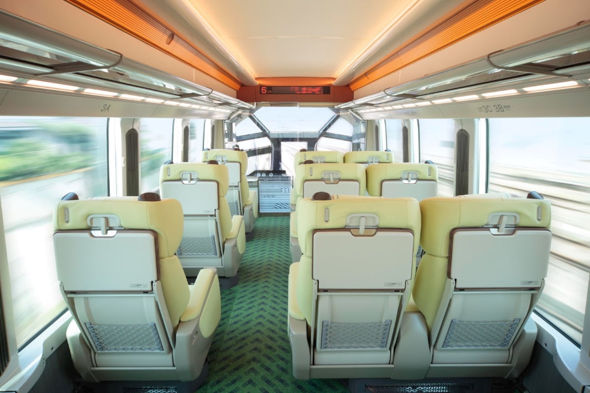 車内はひじ掛けの下から天井まで窓が広がり、明るく開放的な空間