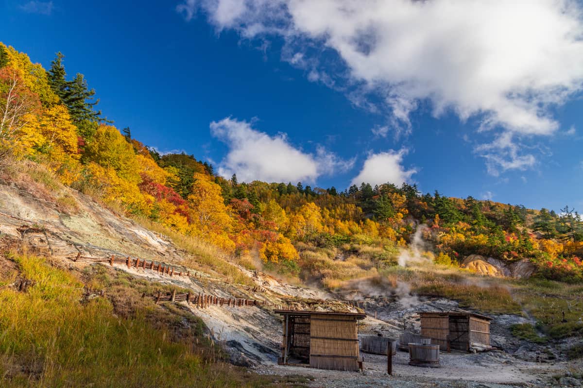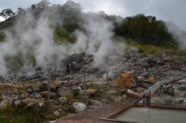 さらに、宿から数百m離れた岩場では、絶え間なく蒸気が立ち上る中、枡や樽、岩風呂など5つの混浴野天風呂が堪能できます。