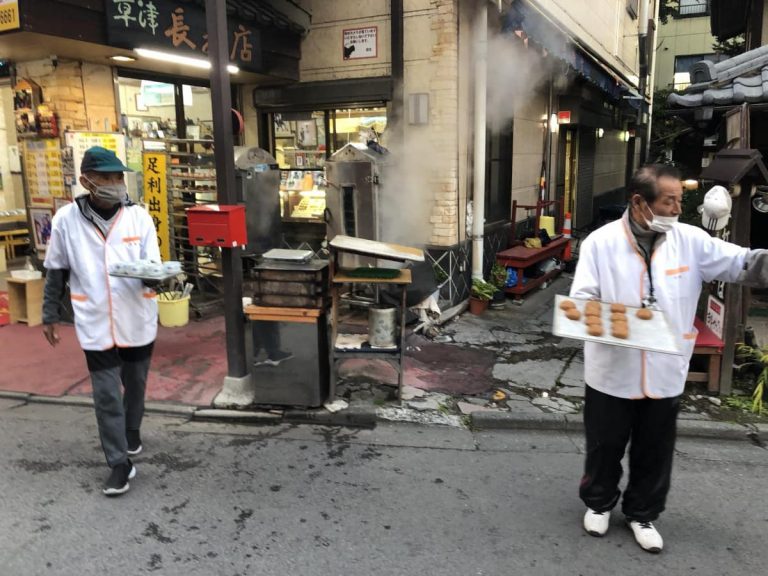 旅の途中で試食もまた楽しみのひとつ…。草津の街並みを見ながらお饅頭の食べ比べはいかがでしょうか?