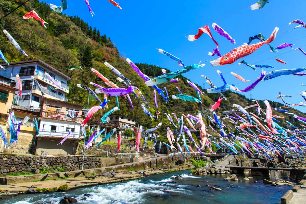 3,000もの鯉のぼりたちが、川の上空をふわふわと泳ぐ祭りは、春の風物詩となっています。