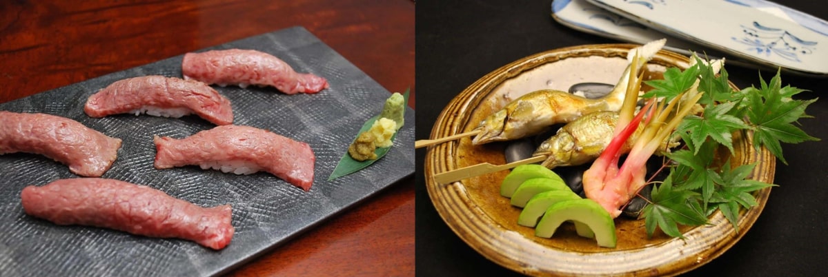提供:香雲館(お料理の一例:上州牛にぎり(左)、若鮎塩焼き(右))