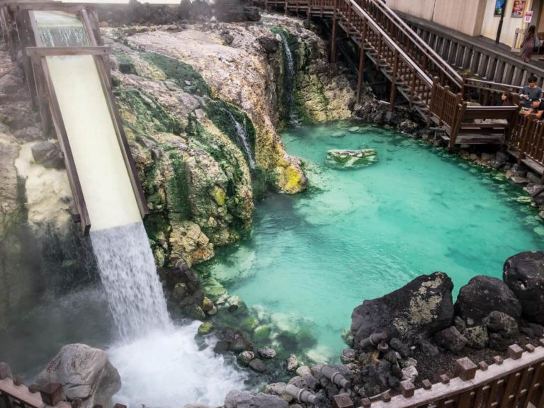 硫黄の匂いが立ち込める湯畑は圧巻です。