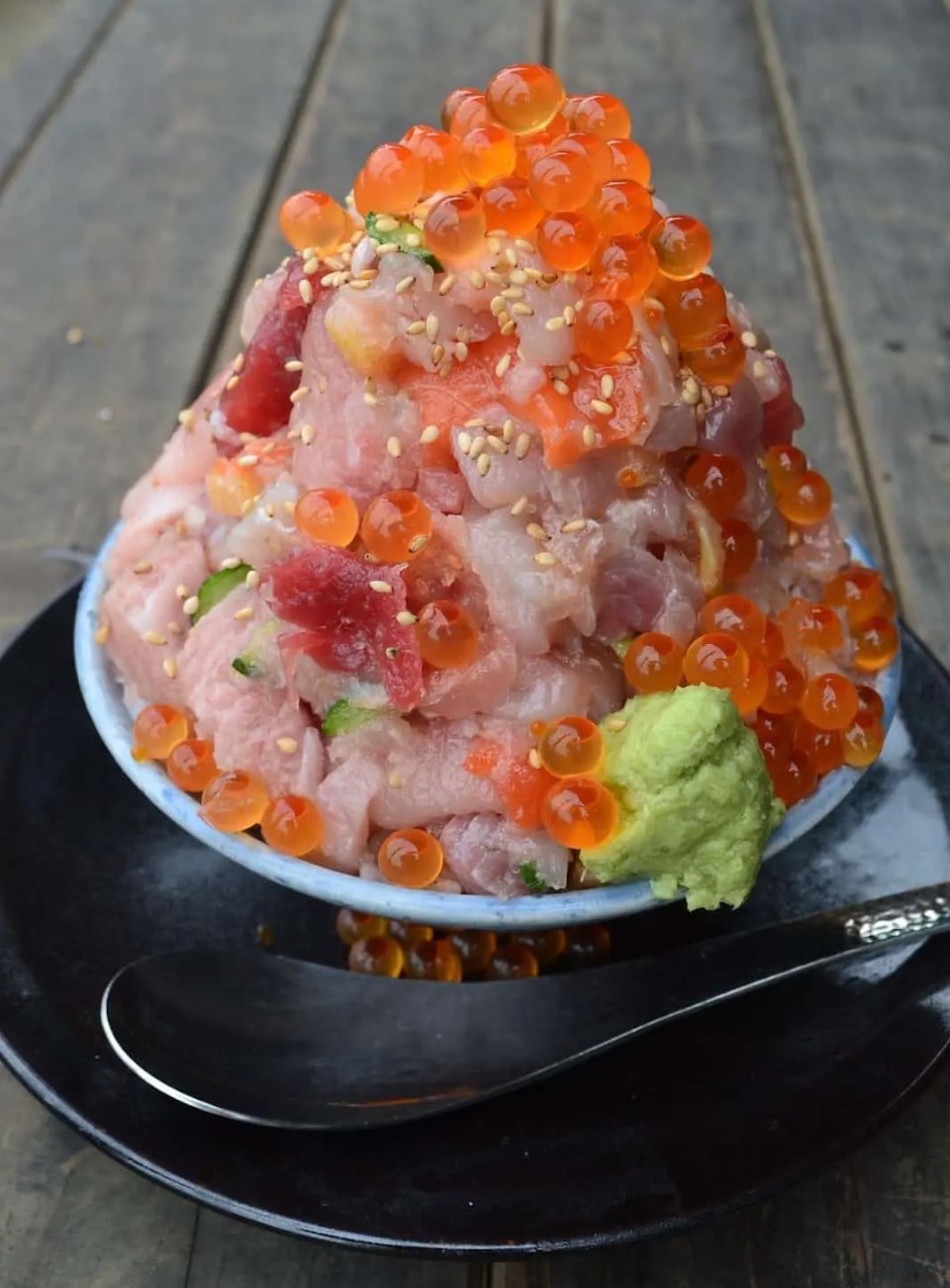 太平洋に面する熱海温泉には、新鮮な海鮮料理を中心にさまざまなグルメスポットが揃います。「熱海銀座おさかな食堂」の「海鮮てっぺん丼」(2,728円、小丼1,628円)は、てんこ盛りになった鮮魚に圧倒される一品。
