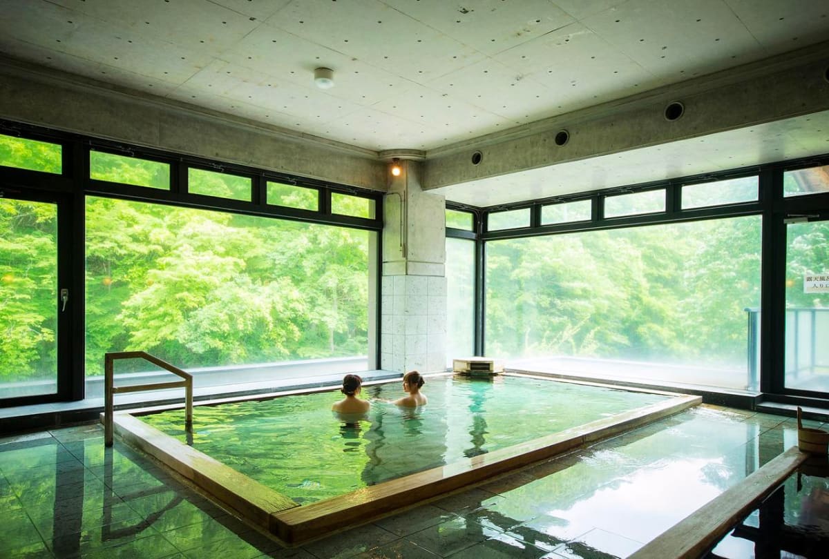 高い天井とガラス窓が圧倒的な開放感のある「山水の湯」の内風呂は、まるで絵画のような山の四季の景色を眺めながら浸かれる温泉です。