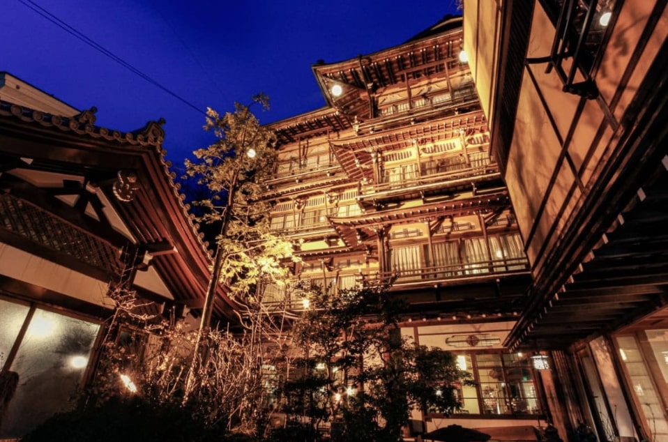 長野県にある「信州浅間温泉 仙聚樓(せんじゅろう) 栄の湯」は、赤い壁とギザギザの屋根が特徴的な昭和27年(1952年)創業の宿です。