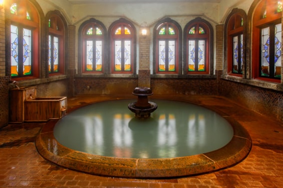 斉月楼や大広間と共に作られた風呂や、戦後の洋風文化の流行を取り入れたステンドグラスがレトロな雰囲気の浴場など、浴場でも昭和を感じることができます。