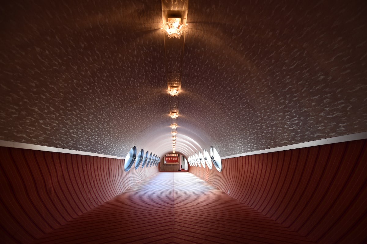 円筒状の通路にはレトロなカーペットが敷かれ、両側には楕円形の窓がずらりと並び、どこか近未来な雰囲気もあります。