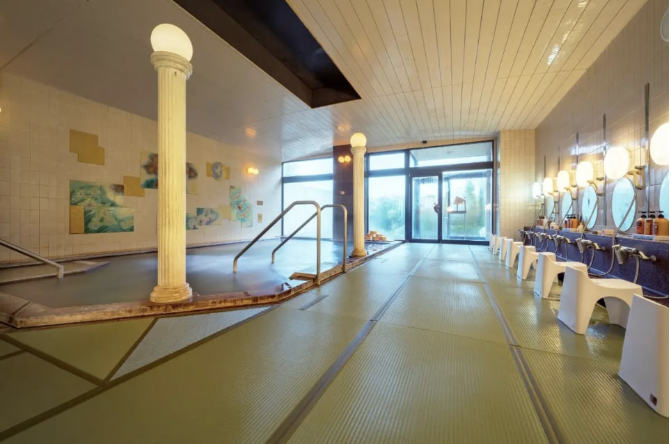 男女別の大浴場の床には柔らかな畳が敷き詰められており、滑りにくく安心して入浴できます。他に、開放感あふれる野天風呂もあります。