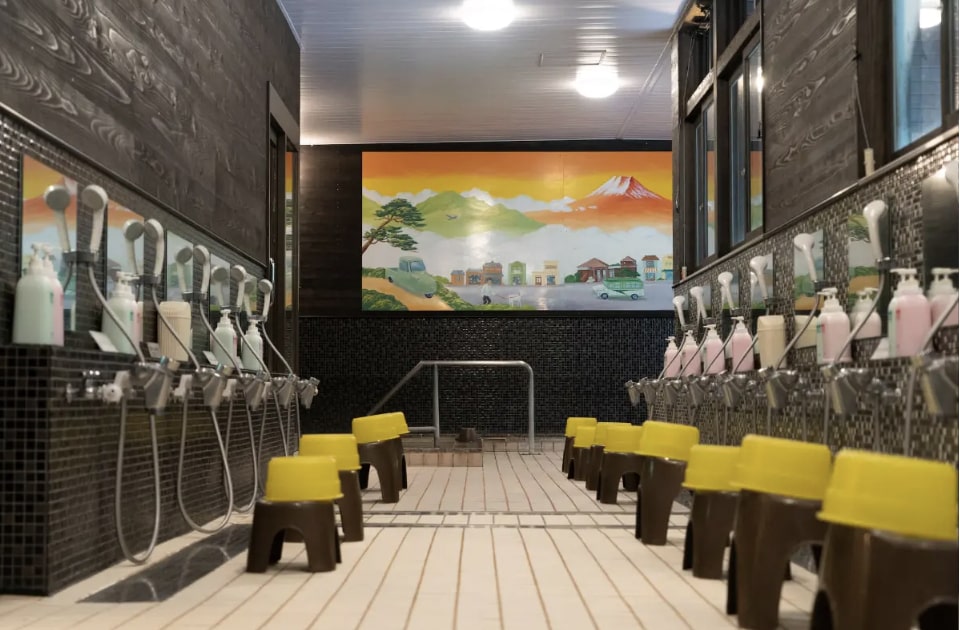 赤富士と昭和の街並みのペンキ絵は、まるで下町の銭湯のよう。浴場も懐かしい雰囲気にあふれます。