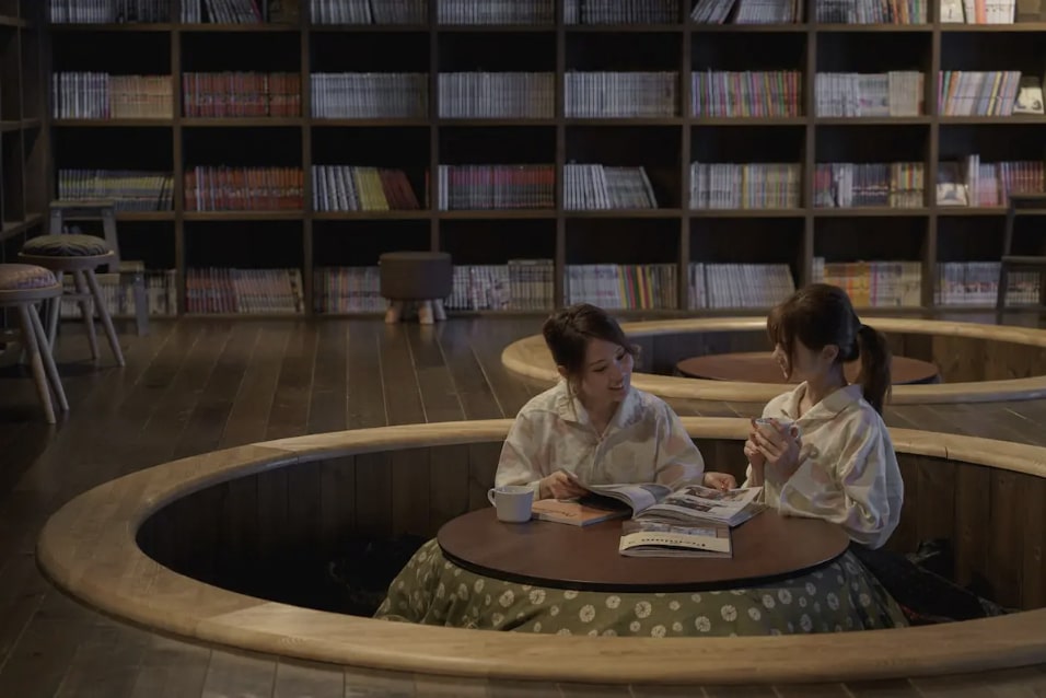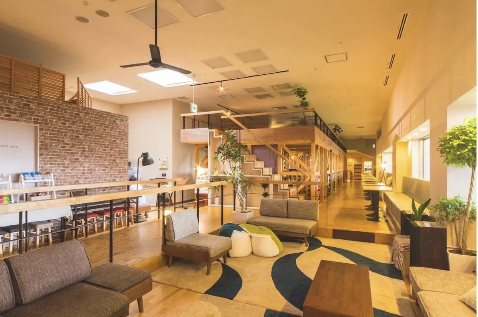 リラックスコーナーやラウンジも大変おしゃれ。木のぬくもりを感じるカフェでお腹を満たしたり、本棚からお気に入りの1冊を見つけて読んだりと、1日中のんびりくつろげます。