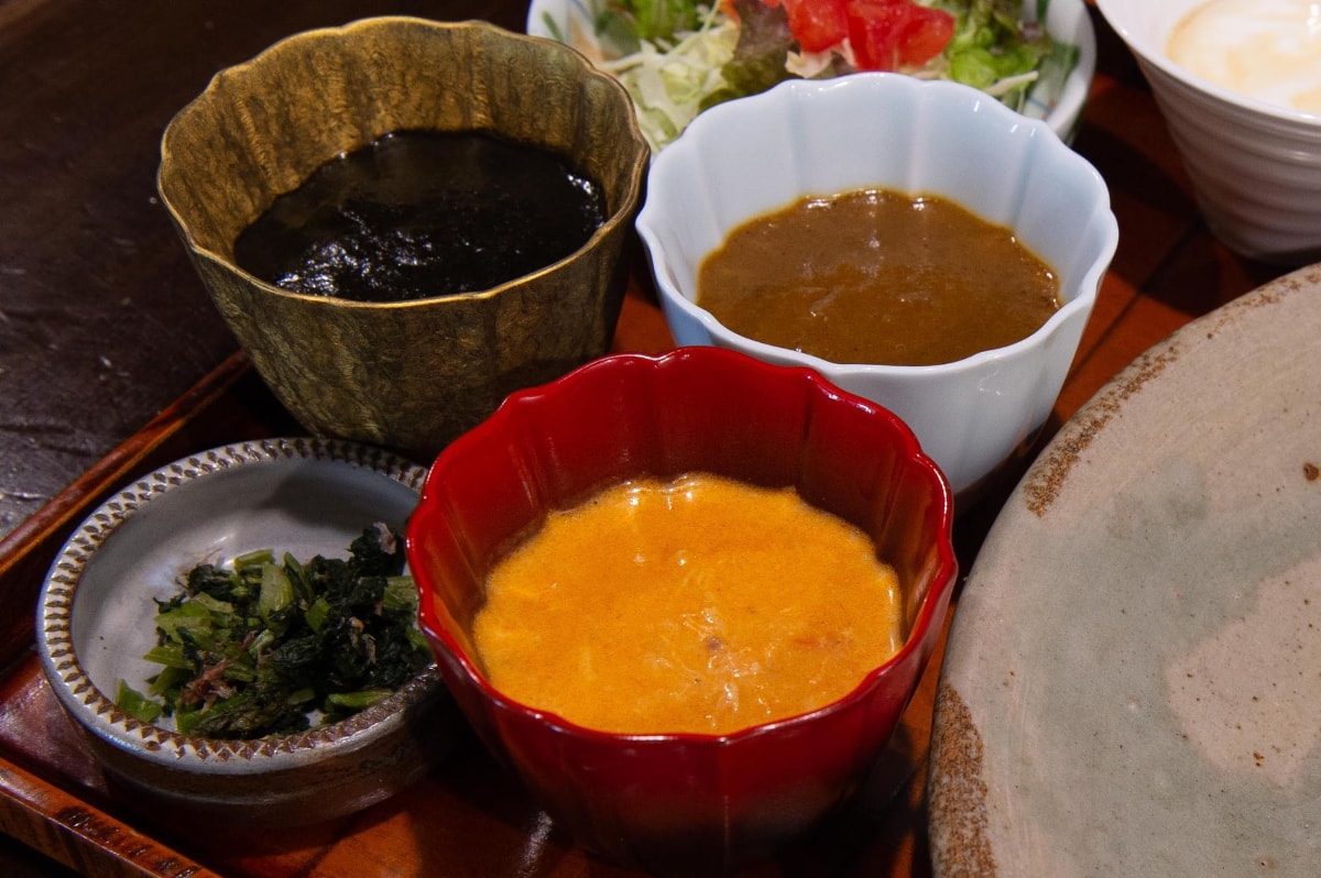 馬肉を煮込んだカレー、小国ジャージー牛と肥後赤どりを使ったカレー、阿蘇の黒豚を使った黒カレーの3種類が1度に味わえるランチメニューです。