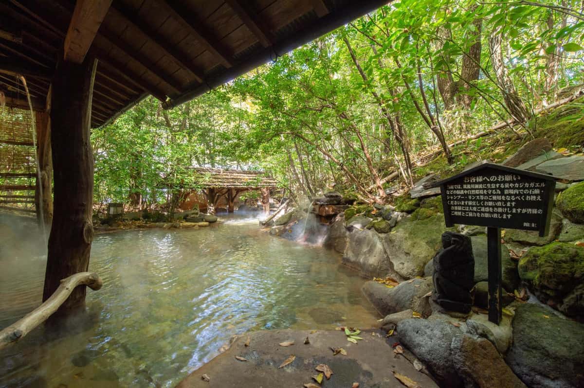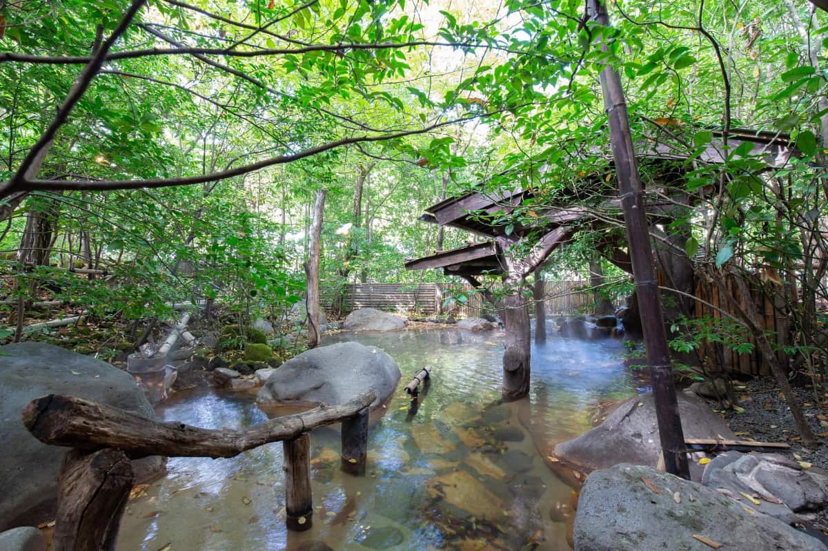 風の舎からほど近い場所にあるお宿 のし湯で、雑木林に囲まれた自然味あふれる野天風呂を楽しみます。