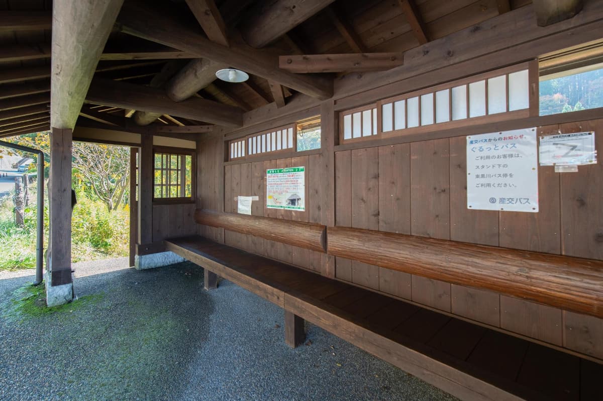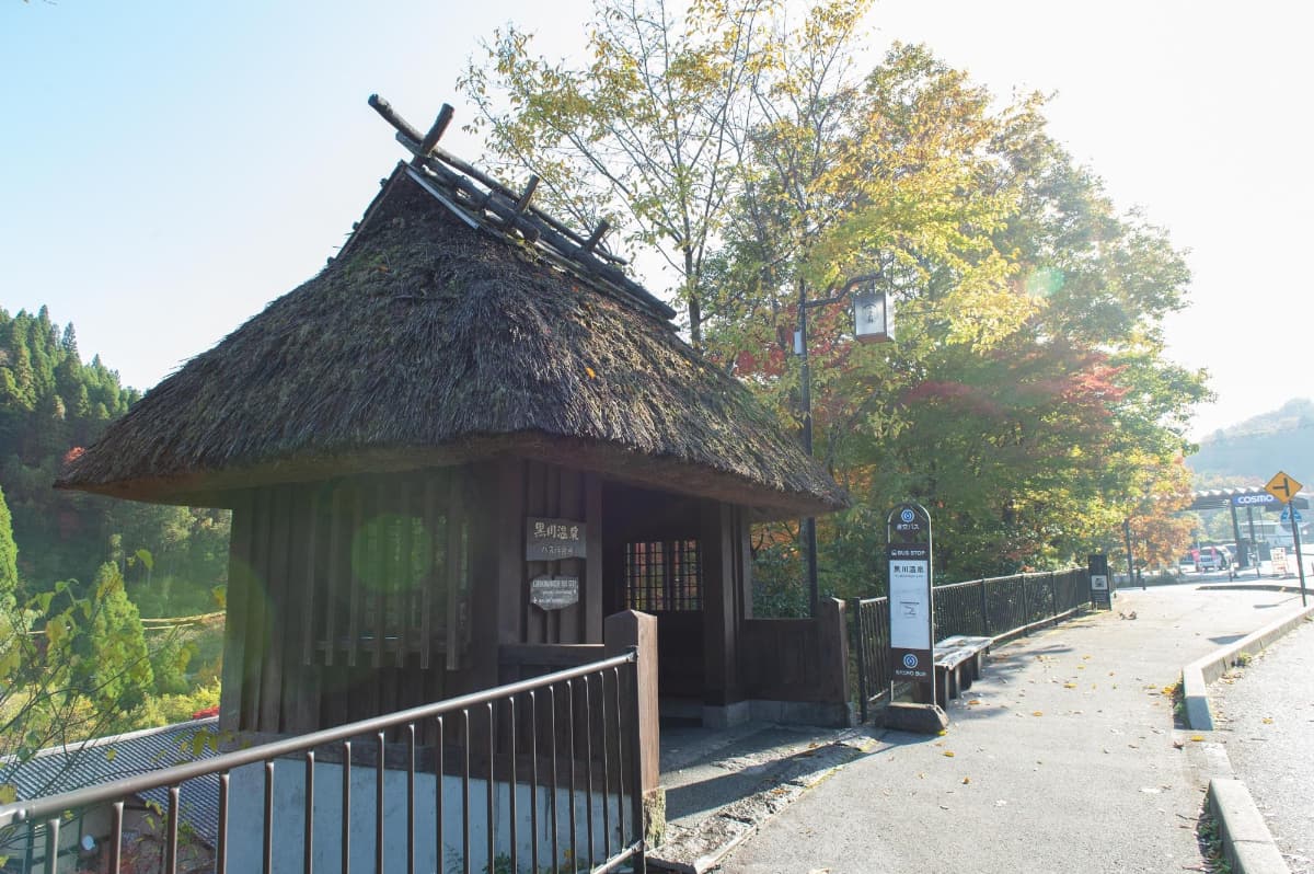 かやぶき屋根の黒川温泉バス停がお出迎え。