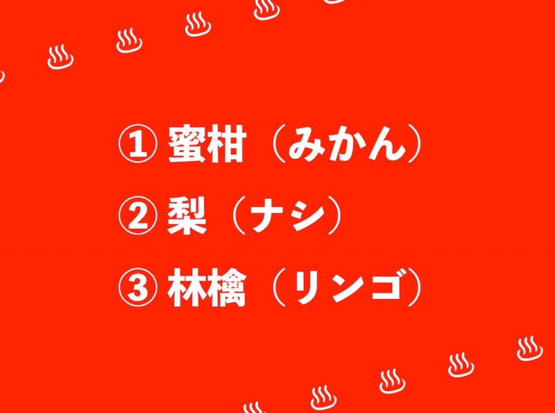 浴場の小ネタ「山形県朝日町の温泉に浮かぶフルーツとは?」の答えはこちら。