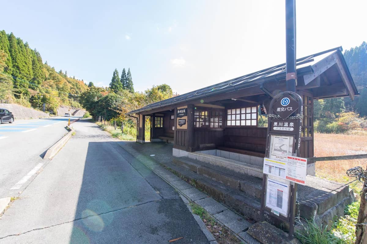 バスを下車すると、かやぶき屋根が特徴的な黒川温泉バス停が出迎えてくれます。