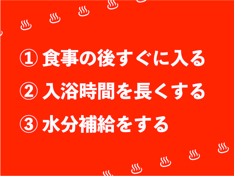 水分補給は、入浴前はもちろん、できれば入浴中にも行うことが望ましいです。食事の直後に入ると、消化不良や胃腸の負担になりますし、入浴時間を長くすると、体力や血圧の低下などのリスクが高まります。