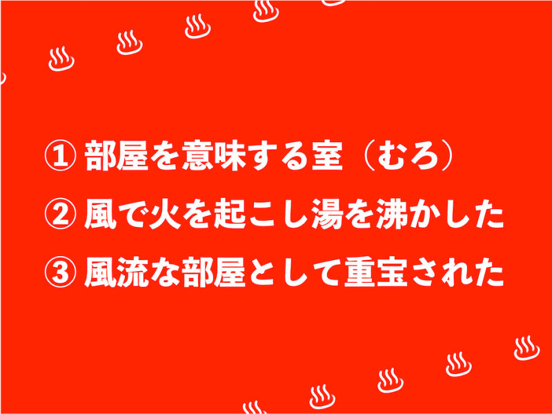 昔(奈良時代?)の風呂は、蒸し風呂だったそうです。その蒸気を逃がさないための小さな室(むろ)があり、その室で疲れを癒やしていました。その室が風呂という言葉に変化していったといわれています。