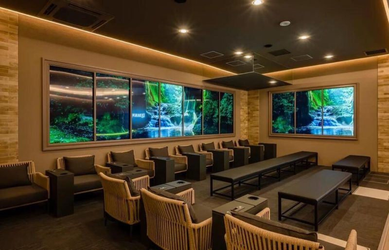 広々とした空間には、時間帯に合わせて切り替わる映像や、極上のリラックスタイムを演出するBGM、そしてアロマの香りが漂っています。