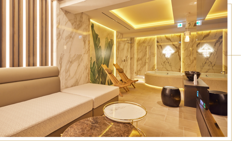 広大なホテルの敷地内にある男性専用のドライサウナと女性専用のマーブルサウナの他、サウナの前後に利用できる浴室や水風呂も備わっている。男女別のリラクゼーションラウンジやトリートメントルームでアフターサウナの時間を過ごせる。