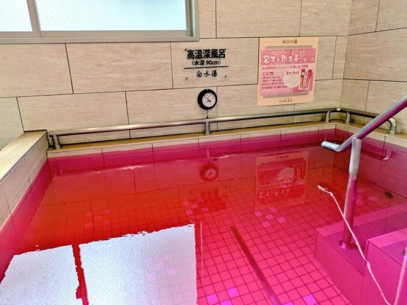 白水湯の売りの一つが、この水深90㎝の高温深風呂。時期によって日替わりの薬湯になることもあり、「岩下の新生姜」色になることも。色も効能も日によって様々で、毎日通うような地元の人にとって飽きの来ない、地域密着型の銭湯ならではの工夫と言えるでしょう。