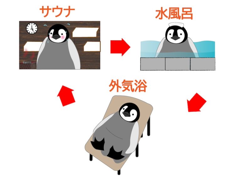 ずばりサウナでの1セットとは、「サウナ」→「水風呂」→「外気浴」のルーティーンのことを指します。そしてこのセットを3セットほど繰り返すのが一般的です。