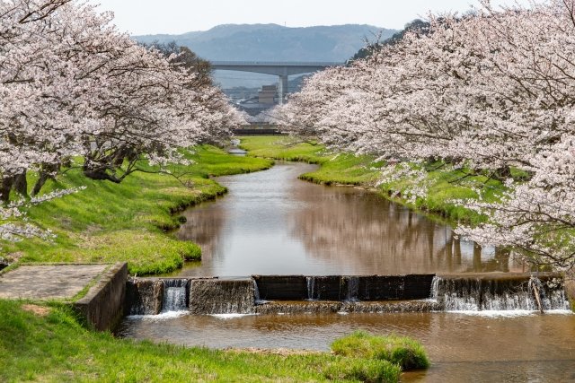 玉湯川の桜は、玉造温泉街を流れる川沿い約2kmに約400本のソメイヨシノが植えられています。夜間は、スポットライトや手作り提灯でライトアップされ、幻想的な夜桜を楽しめます。開花時期は3月下旬から4月上旬で、川両岸が桜色に染まる美しい景色が特徴的です。国道9号線から玉造温泉街にかけて続く桜並木は、地域の人気お花見スポットとなっています。