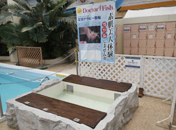 足の古い角質をついばんできれいにしてくれるドクターフィッシュ。プールサイドにあるのでお気軽にどうぞ!