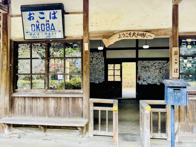 大畑駅(おこばえき)は、熊本県人吉市にあるJR肥薩線の駅で、日本で唯一ループ線とスイッチバックを併せ持つ秘境駅として知られています。1909年に開業し、駅舎内には訪問者の名刺が貼られており、出世のパワースポットとされています。アニメ『夏目友人帳』の舞台のモデルとなったことでも有名です。駅周辺には桜の木が多く、春には美しい景観が広がります。