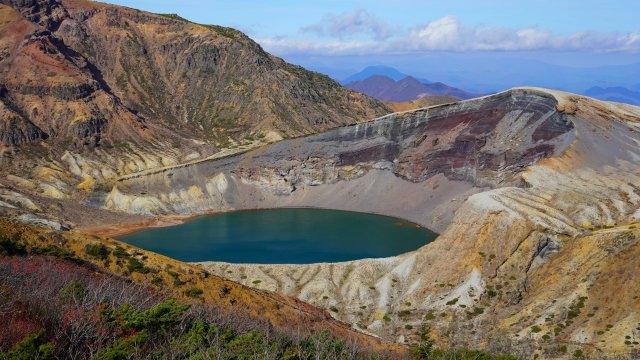 蔵王の御釜は、宮城県刈田郡にある蔵王連峰の中央部に位置する火口湖です。1182年の噴火で形成され、周囲約1km、直径約325m、最大水深27.6mの円形をしています。強酸性の水質のため生物は生息していません。エメラルドグリーンやるり色など、天候や光の具合で湖面の色が変化することから「五色沼」とも呼ばれ、蔵王のシンボルとして知られています。通常4月下旬から11月上旬まで観光可能で、展望台からの眺めが人気です。