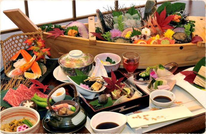 お料理をいただけるのは掘りごたつのある食事処で、これまた北国の雰囲気を満喫できます。岩内や積丹の名産の新鮮な魚介類を中心に、一つ一つ丁寧に作られた会席料理をおいしくいただけるお宿です。アワビやウニなどの高級食材をふんだんに盛り込んだ船盛りは、普段食べられない新鮮な味。他にも海の幸や山の幸を繊細な味に仕立てた和食会席が人気です。