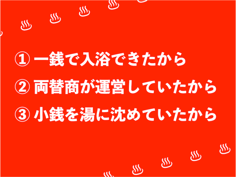 この永楽一銭は、現代の貨幣価値に計算し直すと100円程度とされており、そのリーズナブルさから銭の文字を取って『銭湯』と呼ばれるようになったと言われています。