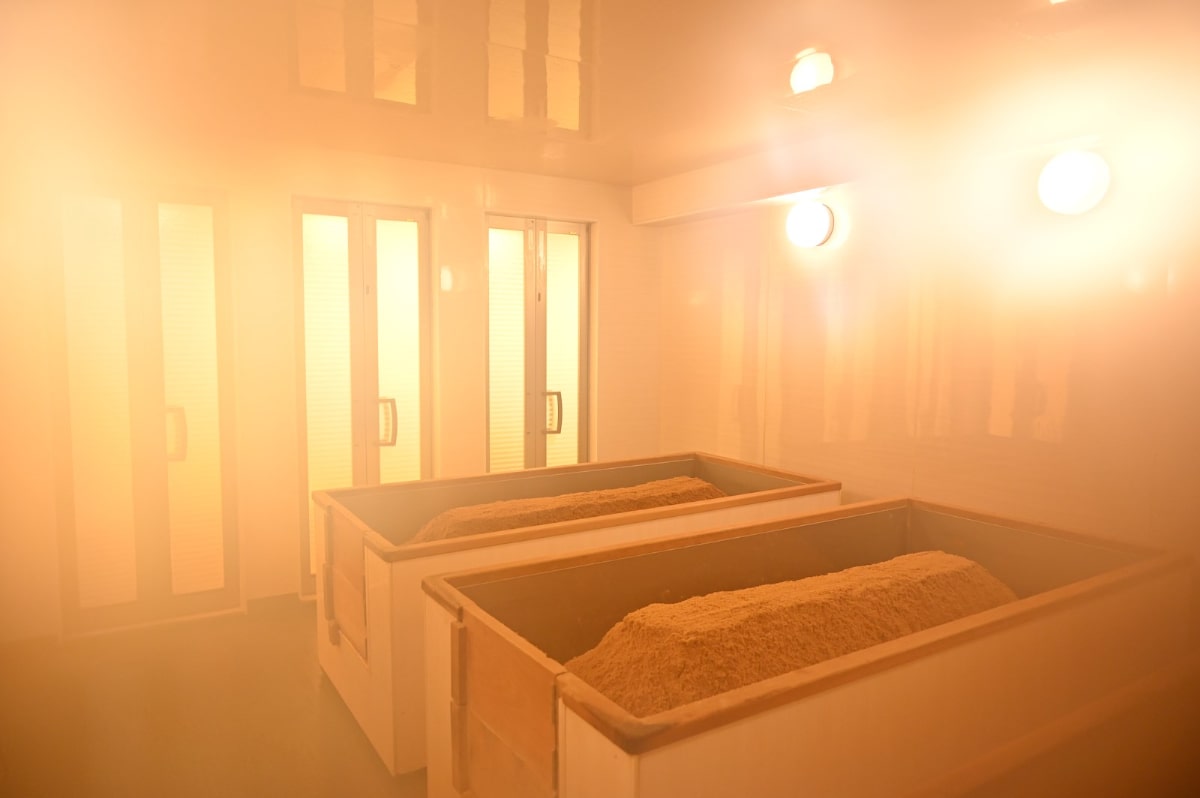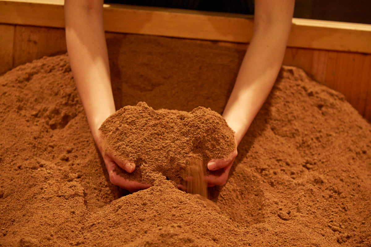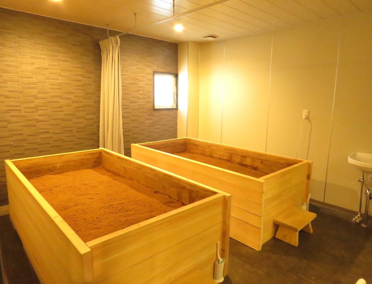 一般的なお風呂に浸かる方法とは異なり、砂風呂のように実際に米ぬかなどの中に身体を埋めて効用を実感することができる方法です。