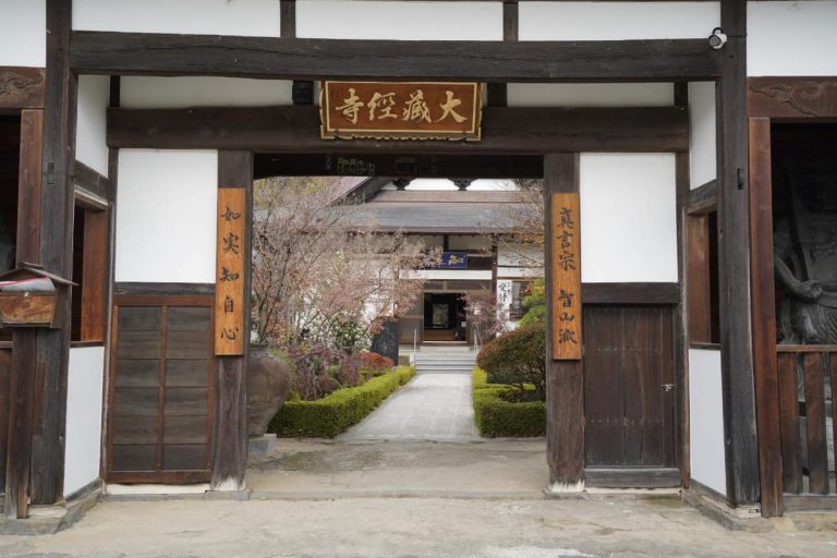 大蔵経寺は甲斐真言宗七壇林(だんりん)のひとつで、本尊は不動明王です。寺伝によると、奈良時代の僧侶である行基(ぎょうき)によって722年に開創されたとしています。