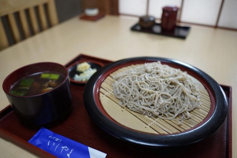 もつ盛りそばは、出汁のきいた温かい蕎麦汁の中に甲州郷土料理の鳥もつが入った石和の名物メニューです。