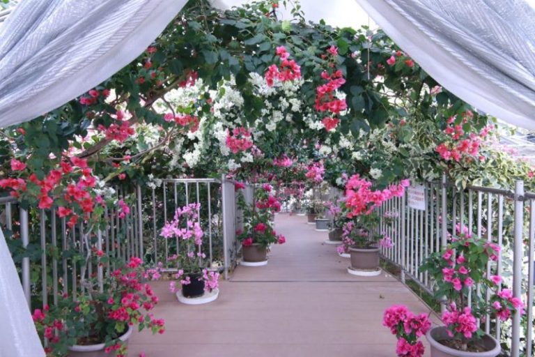 ブーゲンハウス嬉野は、250坪もの広大な温室に年間を通して25種類以上、約400本の美しいブーゲンビリアが咲くスポットです。
